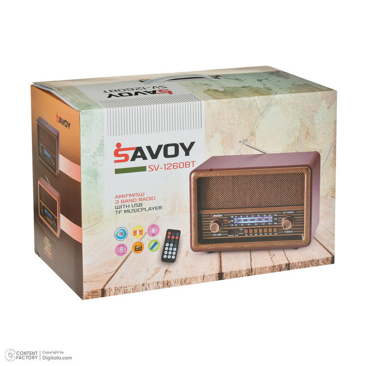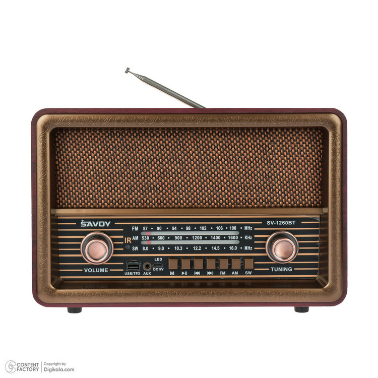 با رادیو کلاسیک (SAVOY)ساووی مدل SV-1260BT، سفر به گذشته را تجربه کنید، اما با فناوری روز دنیا. این رادیو طرح قدیم با ظاهری شیک و کلاسیک، ترکیبی ایدهآل از سنت و مدرنیته است که به هر فضایی جلوهای خاص میبخشد. رادیو ساووی مدل SV-1260BT با پشتیبانی از سه موج رادیویی AM, FM, SW، امکان دسترسی به طیف وسیعی از ایستگاههای رادیویی را فراهم میآورد، تا شما همواره با جدیدترین اخبار، موسیقیها و برنامههای رادیویی بهروز باشید. علاوه بر این، با درگاه USB و TF، شما قادر خواهید بود تا موسیقیهای مورد علاقهتان را از طریق فلش و مموری کارت پخش کنید. همچنین، بلوتوث داخلی این دستگاه امکان پخش موسیقی از گوشی هوشمند یا تبلت شما را بدون نیاز به سیم فراهم میآورد، تا تجربهای بینظیر از شنیدن موسیقی را به ارمغان آورد. دارای باتری شارژی با ظرفیت ۱۲۰۰ میلی آمپر ساعت، رادیو ساووی مدل SV-1260BT تضمین میکند که شما ساعتها بدون نیاز به شارژ مجدد، از گوش دادن به موسیقی یا برنامههای رادیویی لذت ببرید. همچنین، امکان شارژ با برق مستقیم، اطمینان خاطری است برای استفادههای طولانیمدت. ریموت کنترل همراه، استفاده از رادیو طرح قدیم مدل SV-1260BT را بیش از پیش راحت و لذتبخش میکند. با این ریموت کنترل، دسترسی به تمامی قابلیتهای رادیو بدون نیاز به برخاستن از جایتان فراهم میشود. چه برای افزودن به جمع آثار کلاسیک خود میخواهید و چه به دنبال یک هدیه خاص برای دوستداران موسیقی و رادیو هستید، رادیو SAVOY مدل SV-1260BT انتخابی بینظیر است. با این رادیو، نه تنها یک دستگاه پخش موسیقی در اختیار دارید، بلکه یک اثر هنری زیبا و کلاسیک را به مجموعه خود اضافه میکنید. SAVOY SV-1260BTدر نهایت، رادیو ساووی مدل SV-1260BT با ترکیبی از طراحی کلاسیک، قابلیتهای مدرن و کیفیت صدای بینظیر، یک انتخاب عالی برای هر خانه یا محیط کاری است. این رادیو نه تنها زیبایی و سبک را به فضای شما میافزاید، بلکه تجربهای دلنشین از گوش دادن به موسیقی و برنامههای رادیویی را به ارمغان میآورد.